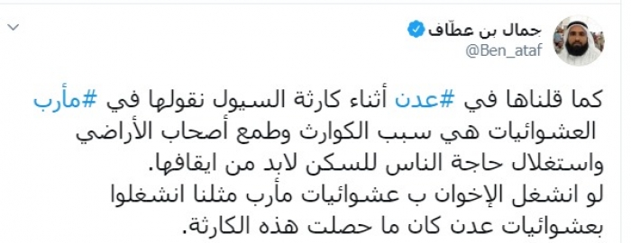 وكتب بن عطاف عبر تغريدة له على" تويتر" رصدها " المشهد العربي":"كما قلناها في عدن أثناء كارثة السيول، نقولها في مأرب العشوائيات هي سبب الكوارث وطمع أصحاب الأراضي واستغلال حاجة الناس للسكن لابد من إيقافها".