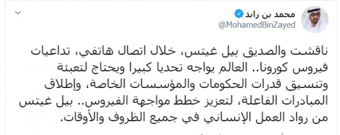 وكتب بن زايد عبر تغريدة له على "تويتر" رصدها " المشهد العربي" :"ناقشت والصديق بيل غيتس، خلال اتصال هاتفي، تداعيات فيروس كورونا".