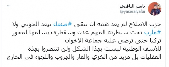 وكتب اليافعي عبر تغريدة له على "تويتر" رصدها " المشهد العربي":"حزب الإصلاح لم يعد همه أن تبقى صنعاء بيد الحوثي ولا مأرب تحت سيطرته المهم عدن وسقطرى يسلمها لمحور تركيا حتى ترضى عليه جماعة الإخوان".