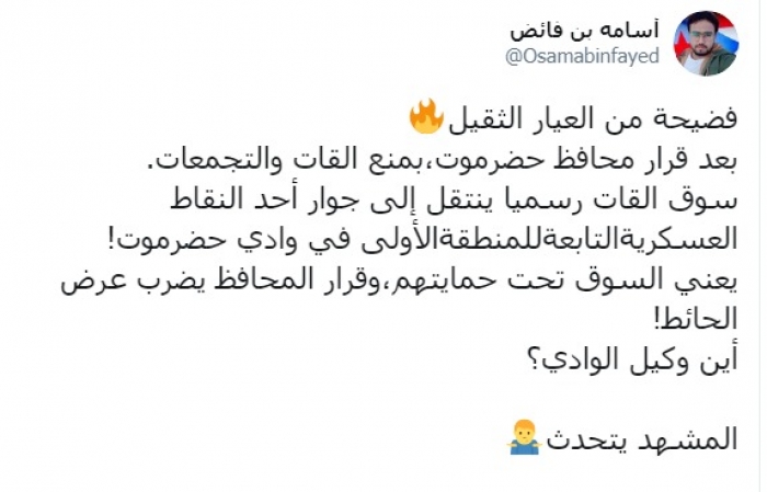 وكتب بن فائض عبر تغريدة له على "تويتر" رصدها " المشهد العربي":"فضيحة من العيار الثقيل ،بعد قرار محافظ حضرموت،بمنع القات والتجمعات،سوق القات رسميا ينتقل إلى جوار أحد النقاط العسكرية التابعة للمنطقة الأولى في وادي حضرموت".