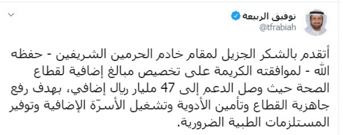 وكتب الربيعة عبر تغريدة له على "تويتر" رصدها " المشهد العربي":"أتقدم بالشكر الجزيل لمقام خادم الحرمين الشريفين - حفظه الله - لموافقته الكريمة على تخصيص مبالغ إضافية لقطاع الصحة حيث وصل الدعم إلى 47 مليار ريال إضافي".
