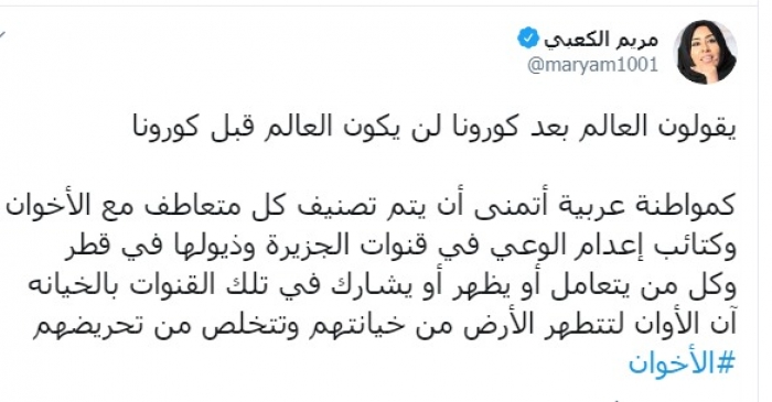 وكتبت الكعبي عبر تغريدة لها على "تويتر" رصدها " المشهد العربي":"يقولون العالم بعد كورونا لن يكون العالم قبل كورونا ،كمواطنة عربية أتمنى أن يتم تصنيف كل متعاطف مع الإخوان وكتائب إعدام الوعي في قنوات الجزيرة وذيولها في قطر وكل من يتعامل أو يظهر أو يشارك في تلك القنوات بالخيانة".