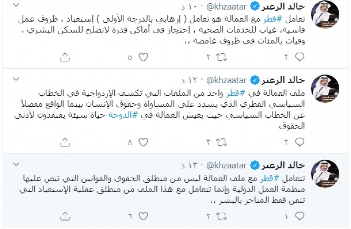 وتابع :"تعامل قطر مع العمالة هو تعامل ( إرهابي بالدرجة الأولى ) استعباد ، ظروف عمل قاسية، غياب للخدمات الصحية ، احتجاز في أماكن قذرة لا تصلح للسكن البشري ، وفيات بالمئات في ظروف غامضة".