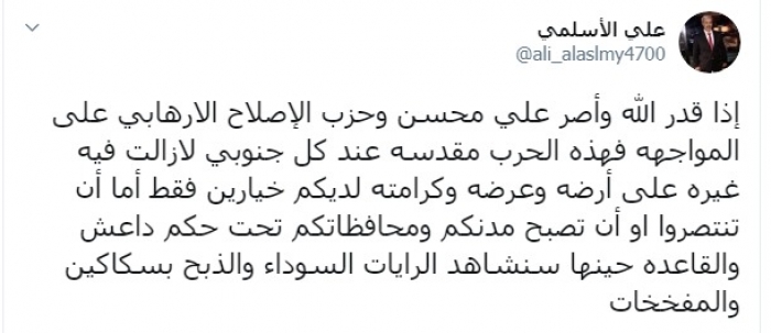 وكتب الأسلمي عبر تغريدة له على "تويتر" رصدها " المشهد العربي":"إذا قدر الله وأصر علي محسن وحزب الإصلاح الإرهابي على المواجهة فهذه الحرب مقدسة عند كل جنوبي لازالت فيه غيره على أرضه وعرضه وكرامته".