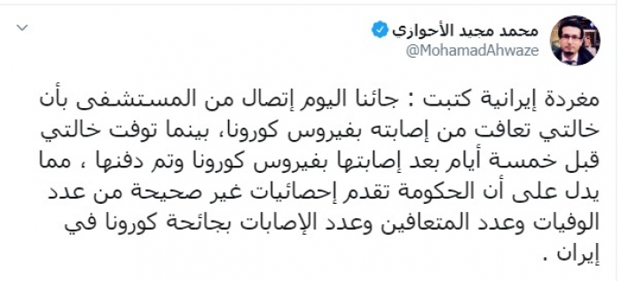 وكتب عبر تغريدة له على "تويتر" رصدها " المشهد العربي":"مغردة إيرانية كتبت : جائنا اليوم اتصال من المستشفى بأن خالتي تعافت من إصابته بفيروس كورونا، بينما توفت خالتي قبل خمسة أيام بعد إصابتها بفيروس كورونا وتم دفنها".