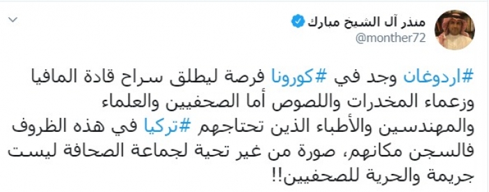 وكتب آل الشيخ عبر تغريدة له على "تويتر" رصدها " المشهد العربي":"أردوغان وجد في كورونا فرصة ليطلق سراح قادة المافيا وزعماء المخدرات واللصوص".