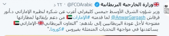 وقالت وزارة الخارجية البريطانية في تغريدة :"وزير شؤون الشرق الأوسط جيمس كليفرلي أعرب عن شكره لنظيره الإماراتي د.أنور قرقاش لما قدمت الإمارات من دعم بإبقائها لمطاراتها مفتوحة لأجل عودة البريطانيين إلى بلدهم".