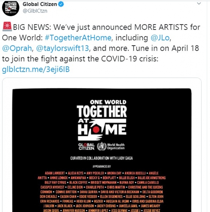 وكانت المغنية الشهيرة ليدي جاجا قد أعلنت عن الحدث الأسبوع الماضي لكن عدد المشاركات فيه زاد كثيرا ويشمل الآن بعضا من أكبر الأسماء في عالم المشاهير مثل سيلين ديون وبيلي إيليش وجون ليجند وإلتون جون وبول مكارتني وكريس مارتن وآندريا بوتشيلي ومايكل بوبليه.