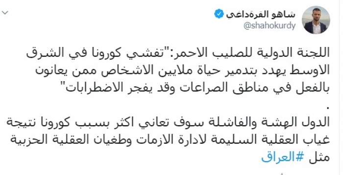 وكتب عبر تغريدة له على "تويتر" رصدها " المشهد العربي":"اللجنة الدولية للصليب الأحمر:"تفشي كورونا في الشرق الأوسط يهدد بتدمير حياة ملايين الأشخاص ممن يعانون بالفعل في مناطق الصراعات وقد يفجر الاضطرابات".
