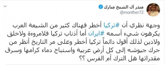 وكتب مبارك عبر تغريدة له على "تويتر" رصدها " المشهد العربي":"وجهة نظري أن تركيا أخطر من الناحية الأيدلوجية على العرب من إيران،فهناك كثير من الشيعة العرب يكرهون شيء أسمه إيران أما أذناب تركيا فلا مروءة ولاخلق ولا دين".