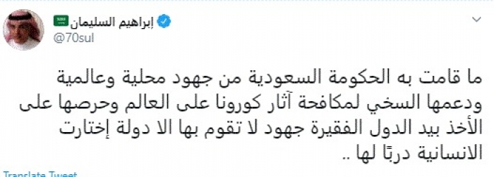 وقال في تغريدة عبر "تويتر" رصدها "المشهد العربي": "ما قامت به الحكومة السعودية من جهود محلية وعالمية ودعمها السخي لمكافحة آثار كورونا على العالم وحرصها على الأخذ بيد الدول الفقيرة جهود لا تقوم بها إلا دولة اختارت الإنسانية دربًا لها".