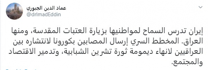 وقال في تغريدة عبر "تويتر" رصدها "المشهد العربي": "إيران تدرس السماح لمواطنيها بزيارة العتبات المقدسة، ومنها العراق. المخطط السري إرسال المصابين بكورونا لانتشاره بين العراقيين لإنهاء ديمومة ثورة تشرين الشبابية، وتدمير الاقتصاد والمجتمع".