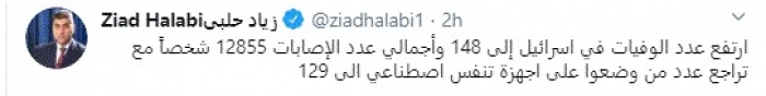 وقال في تغريدة عبر "تويتر" رصدها "المشهد العربي": "ارتفع عدد الوفيات في اسرائيل إلى 148 وإجمالي عدد الإصابات 12855 شخصاً مع تراجع عدد من وضعوا على أجهزة تنفس اصطناعي إلى 129".