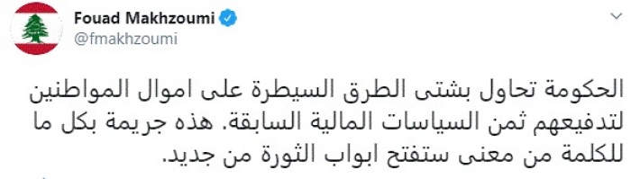 وقال في تغريدة عبر "تويتر" رصدها "المشهد العربي": "الحكومة تحاول بشتى الطرق السيطرة على أموال المواطنين لتدفيعهم ثمن السياسات المالية السابقة. هذه جريمة بكل ما للكلمة من معنى ستفتح أبواب الثورة من جديد".