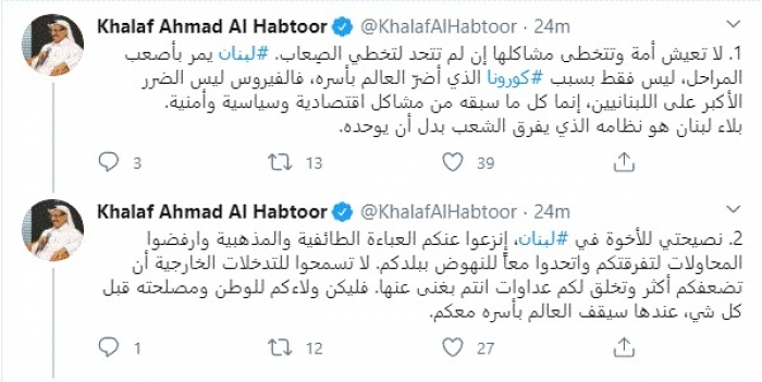 طالب رجل الأعمال الإماراتي خلف الحبتور، اليوم، بنزع الطائفية في لبنان وعدم السماح بالتدخلات الخارجية في شؤون بلادهم، مشيرًا إلى أن لبنان يمر بأصعب المراحل.