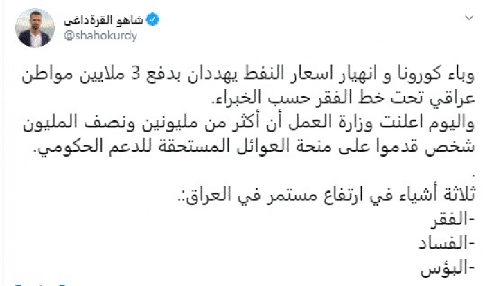 وكتب في تغريدة عبر "تويتر" رصدها "المشهد العربي": "وباء كورونا وانهيار أسعار النفط يهددان بدفع 3 ملايين مواطن عراقي تحت خط الفقر حسب الخبراء. واليوم أعلنت وزارة العمل أن أكثر من مليونين ونصف المليون شخص قدموا على منحة العوائل المستحقة للدعم الحكومي. ثلاثة أشياء في ارتفاع مستمر في العراق: الفقر الفساد البؤس".