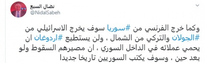 وقال في تغريدة عبر "تويتر" رصدها "المشهد العربي": "وكما خرج الفرنسي من سوريا سوف يخرج الإسرائيلي من الجولان والتركي من الشمال، ولن يستطيع أردوغان أن يحمي عملائه في الداخل السوري، إن مصيرهم السقوط ولو بعد حين، وسوف يكتب السوريين تاريخًا جديدًا".