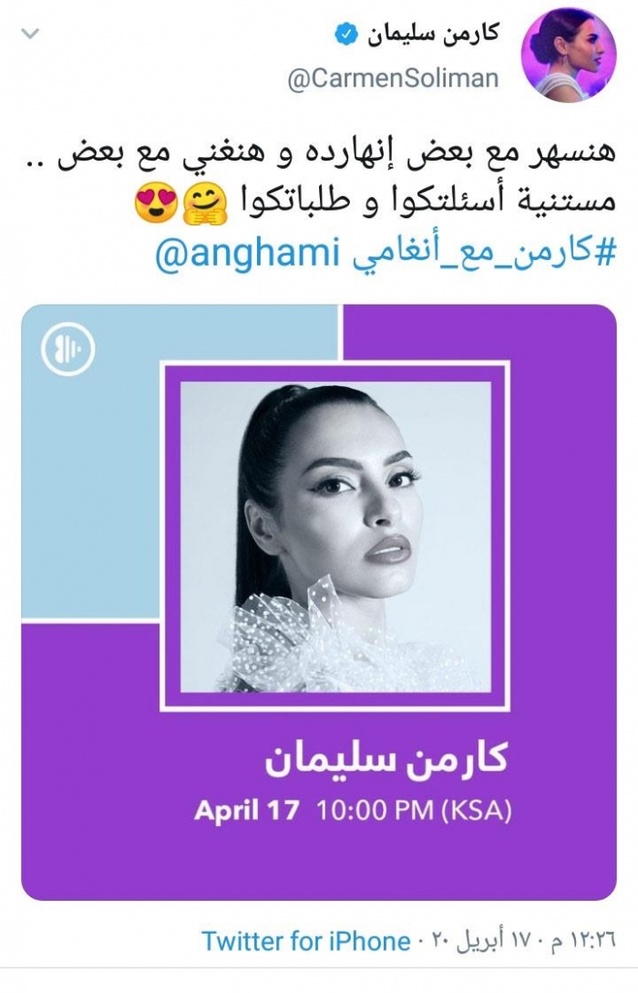 ونشرت كارمن، بوستر لها يحمل التفاصيل، عبر حسابها على تويتر، وعلقت: "هنسهر مع بعض النهاردة، وهنغني مع بعض.. مستنية أسئلتكوا وطلباتكوا.. كارمن مع أنغامي".