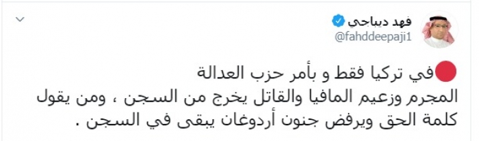 أكد المحلل السياسي السعودي فهد ديباجي، اليوم الجمعة، أن الرئيس التركي رجب طيب أردوغان أفرج عن المجرمين والقتلة من داخل سجون تركيا، فيما أبقى أصحاب كلمة الحق بالداخل.