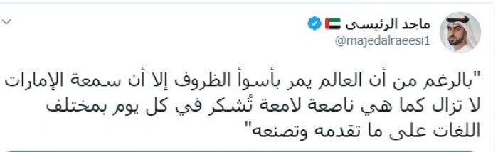 وكتب الرئيسي عبر تغريدة له على "تويتر" رصدها " المشهد العربي":"بالرغم من أن العالم يمر بأسوأ الظروف إلا أن سمعة الإمارات لا تزال كما هي ناصعة لامعة تُشكر في كل يوم بمختلف اللغات على ما تقدمه وتصنعه".
