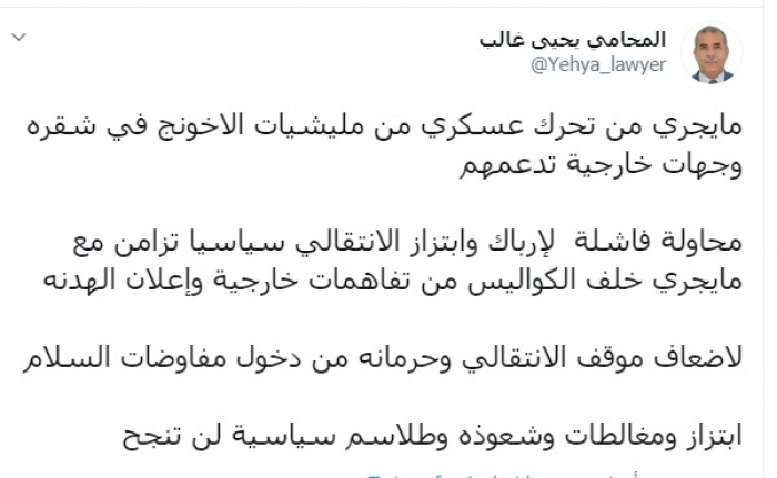 وكتب غالب عبر تغريدة له على " تويتر" رصدها " المشهد العربي":"ما يجري من تحرك عسكري من مليشيات الاخونج في شقرة وجهات خارجية تدعمهم،محاولة فاشلة لإرباك وابتزاز الانتقالي سياسيا".