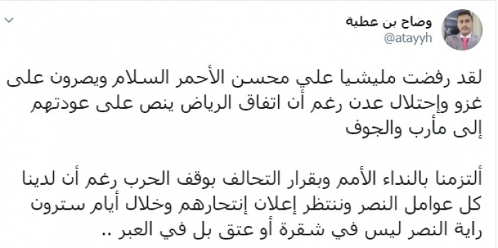 وكتب بن عطية عبر تغريدة له على "تويتر" رصدها " المشهد العربي":"لقد رفضت مليشيا علي محسن الأحمر السلام ويصرون على غزو واحتلال عدن رغم أن اتفاق الرياض ينص على عودتهم إلى مأرب والجوف".