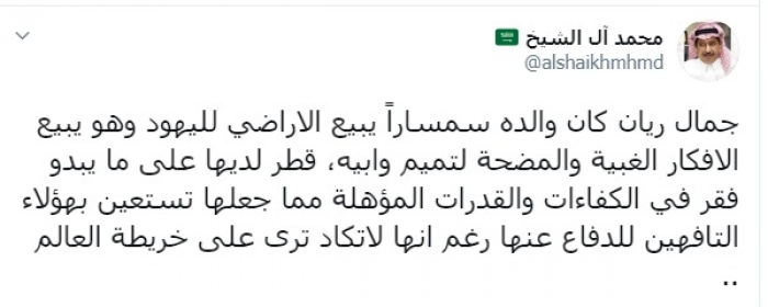 وكتب آل الشيخ عبر تغريدة له على "تويتر" رصدها " المشهد العربي":"جمال ريان كان والده سمساراً يبيع الأراضي لليهود وهو يبيع الأفكار الغبية والمضحة لتميم وأبيه".