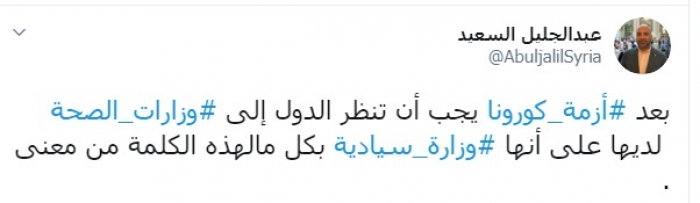 وكتب السعيد عبر تغريدة له على "تويتر" رصدها " المشهد العربي":"بعد أزمة كورونا يجب أن تنظر الدول إلى وزارات الصحة لديها على أنها وزارة سيادية بكل ما لهذه الكلمة من معنى".