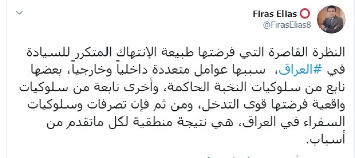 وكتب إلياس عبر تغريدة له على "تويتر" رصدها " المشهد العربي":"النظرة القاصرة التي فرضتها طبيعة الانتهاك المتكرر للسيادة في العراق، سببها عوامل متعددة داخلياً وخارجياً".
