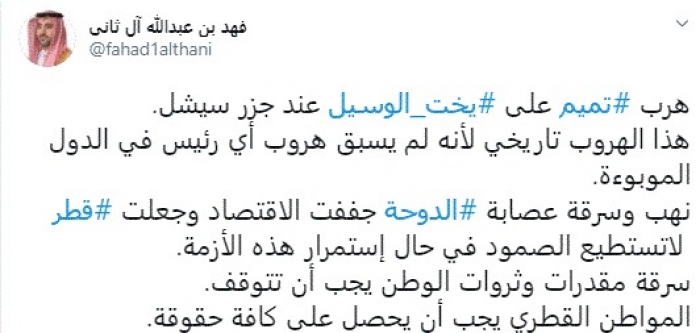 وقال في تغريدة عبر "تويتر" رصدها "المشهد العربي": "هرب تميم على يخت الوسيل عند جزر سيشل. هذا الهروب تاريخي لأنه لم يسبق هروب أي رئيس في الدول الموبوءة".