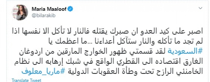 وقالت في تغريدة عبر "تويتر" رصدها "المشهد العربي": "اصبر على كيد العدو إن صبرك يقتله فالنار لا تأكل إلا نفسها إذا لم تجد ما تأكله والنار ستآكل أعداءنا... ما اعظمك يا السعودية لقد قسمتي ظهور الخوارج المارقين من أردوغان الغارق اقتصاده إلى القطري الواقع في شبك إرهابه إلى نظام الخامنئي الرازح تحت وطأة العقوبات الدولية".