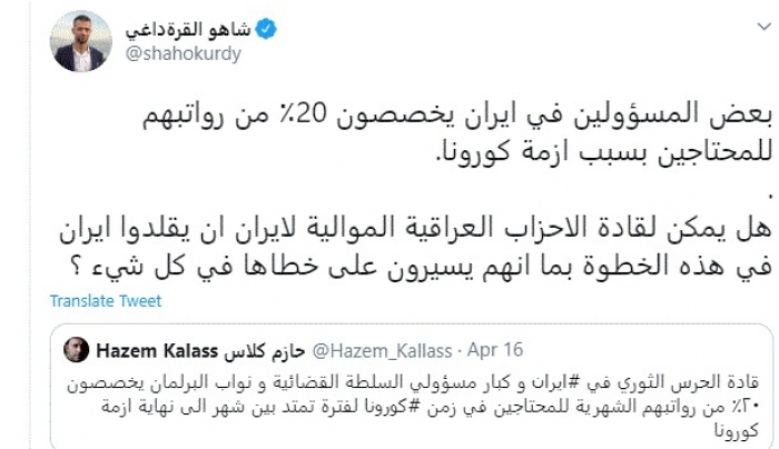 وقال في تغريدة عبر "تويتر" رصدها "المشهد العربي": "بعض المسؤولين في إيران يخصصون 20٪ من رواتبهم للمحتاجين بسبب أزمة كورونا. هل يمكن لقادة الأحزاب العراقية الموالية لإيران أن يقلدوا إيران في هذه الخطوة بما أنهم يسيرون على خطاها في كل شيء؟".