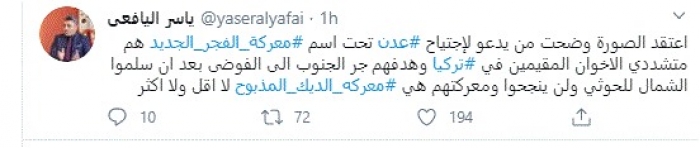وكتب في تغريدة عبر "تويتر" رصدها "المشهد العربي": "اعتقد الصورة وضحت من يدعو لاجتياح عدن تحت اسم معركة الفجر الجديد هم متشددي الإخوان المقيمين في تركيا وهدفهم جر الجنوب إلى الفوضى بعد أن سلموا الشمال للحوثي ولن ينجحوا ومعركتهم هي معركة الديك المذبوح لا أقل ولا أكثر".