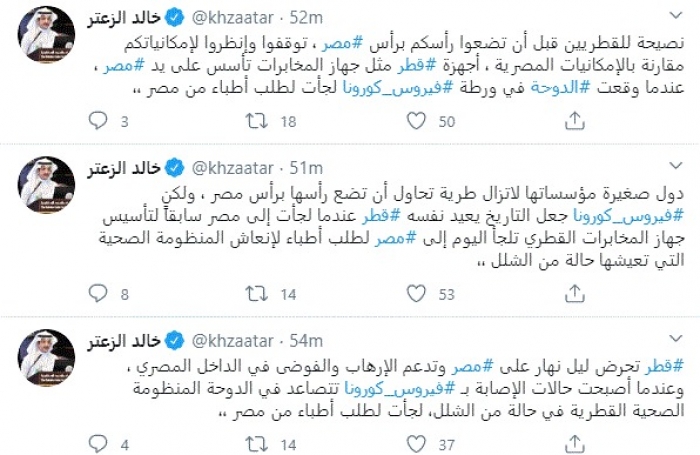 وقال في تغريدات عبر "تويتر" رصدها "المشهد العربي": "قطر تحرض ليل نهار على مصر وتدعم الإرهاب والفوضى في الداخل المصري، وعندما أصبحت حالات الإصابة بفيروس كورونا تتصاعد في الدوحة المنظومة الصحية القطرية في حالة من الشلل، لجأت لطلب أطباء من مصر".