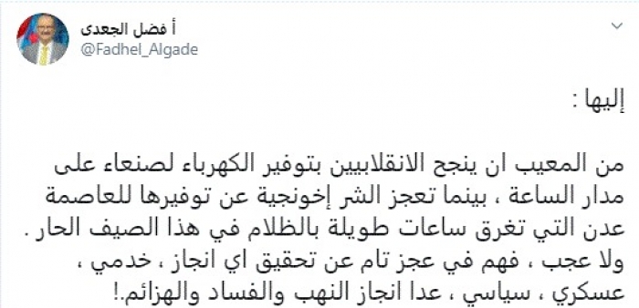 وقال في تغريدة عبر "تويتر" رصدها "المشهد العربي": "من المعيب أن ينجح الانقلابيين بتوفير الكهرباء لصنعاء على مدار الساعة، بينما تعجز الشر إخونجية عن توفيرها للعاصمة عدن التي تغرق ساعات طويلة بالظلام في هذا الصيف الحار".