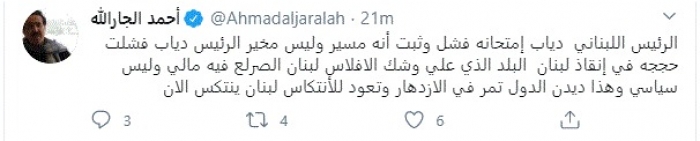 وكتب في تغريدة عبر "تويتر" رصدها "المشهد العربي": "الرئيس اللبناني دياب امتحانه فشل وثبت أنه مسير وليس مخير الرئيس دياب فشلت حججه في إنقاذ لبنان البلد الذي علي وشك الإفلاس".