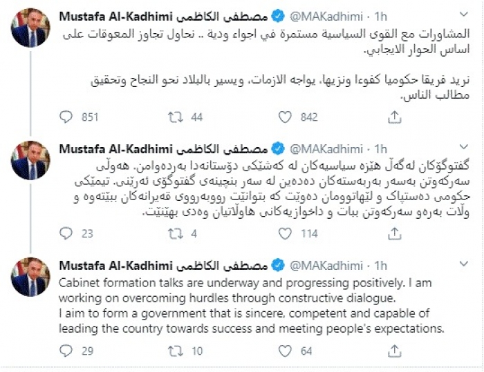 أعلن رئيس الوزراء العراقي المكلف مصطفى الكاظمي، اليوم، أن المشاورات مع القوى السياسية مستمرة في أجواء ودية، مضيفًا أن الأطراف تحاول تجاوز المعوقات على أساس الحوار الإيجابي.