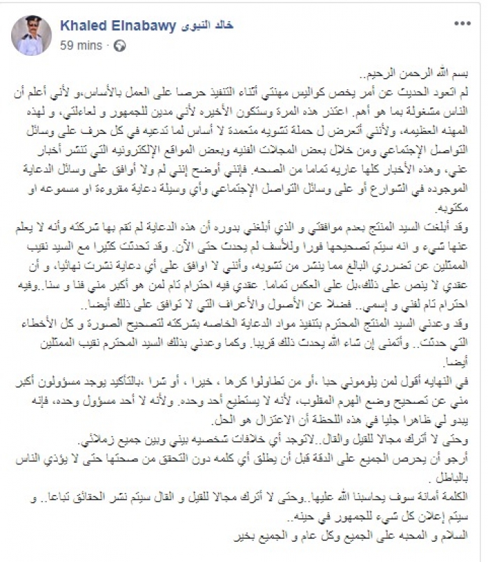 وأضاف النبوي "أتعرض لحملة تشويه متعمدة لا أساس لما تدعيه في كل حرف على وسائل التواصل الإجتماعي ومن خلال بعض المجلات الفنية وبعض المواقع الإليكترونية التي تنشر أخبار عني، وهذه الأخبار كلها عارية تماما من الصحة. فإنني أوضح إنني لم ولا أوافق على وسائل الدعاية الموجوده في الشوارع أو على وسائل التواصل الإجتماعي وأي وسيلة دعاية مقروءة أو مسموعة أو مكتوبة".