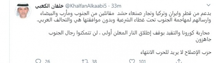 الكعبي لـ الإخوان: لن تتمكنوا من أهدافكم.. ورجال الجنوب جاهزون