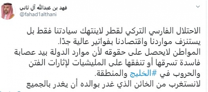 وقال في تغريدة عبر "تويتر" رصدها "المشهد العربي": "الاحتلال الفارسي التركي لقطر لا ينتهك سيادتنا فقط بل يستنزف مواردنا واقتصادنا بفواتير عالية جدًا".