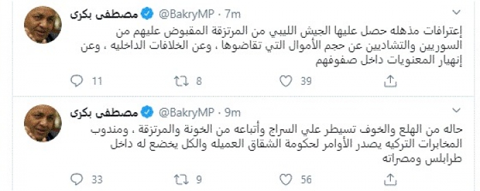 وقال في تغريدات عبر "تويتر" رصدها "المشهد العربي": "حالة من الهلع والخوف تسيطر علي السراج وأتباعه من الخونة والمرتزقة، ومندوب المخابرات التركية يصدر الأوامر لحكومة الشقاق العميله والكل يخضع له داخل طرابلس ومصراتة".