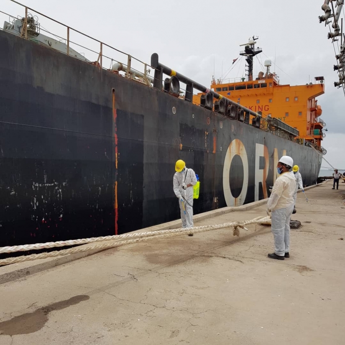 سمحت سلطات الميناء للسفينة بالرسو بعد فحص فريق طبي أفراد طاقمها، مرعاة للتدابير الوقائية من عدوى فيروس كورونا.