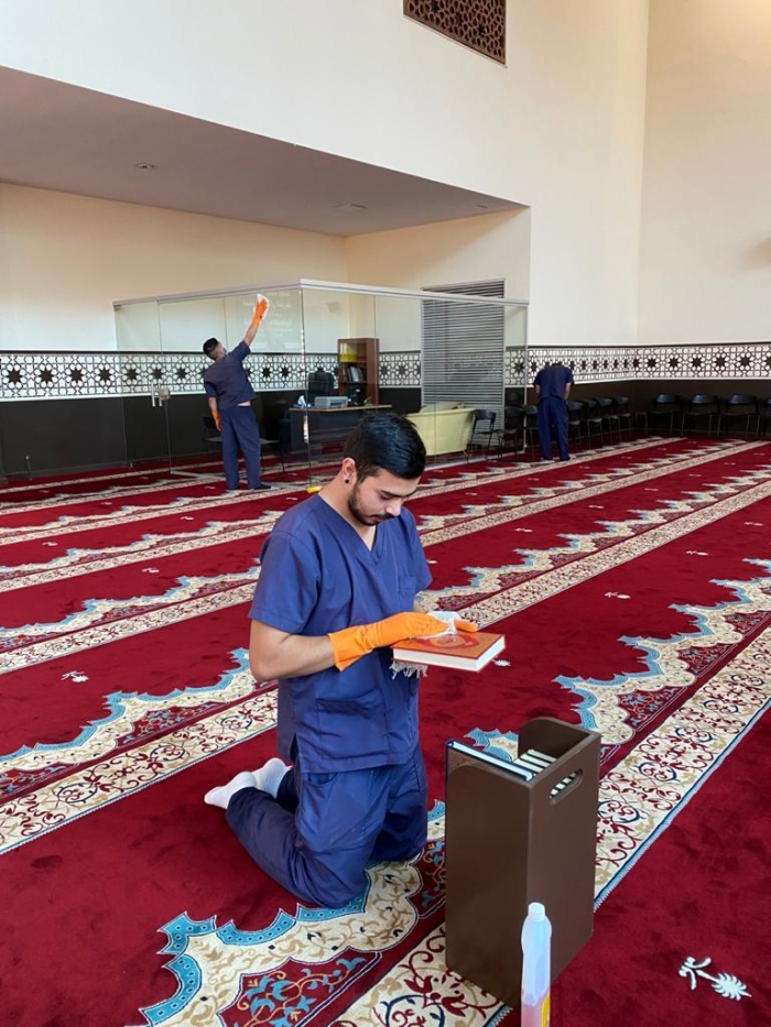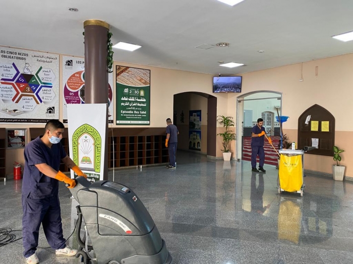 وسلط التقرير الضوء على تعقيم جامع الملك فهد، وجميع محتوياته ومرافقه من سجاد ومصاحف ودواليب المصاحف والأبواب والنوافذ ودورات المياه وفق أعلى معايير الجودة، كما شملت عمليات التعقيم بالمركز شملت قاعة الملك سلمان للمؤتمرات، والملحقية الدينية، وفصول التعليم، وقاعات التدريب، والمرافق الرياضية، والمكتبة، والمكاتب الإدارية، والقرية الشعبية.