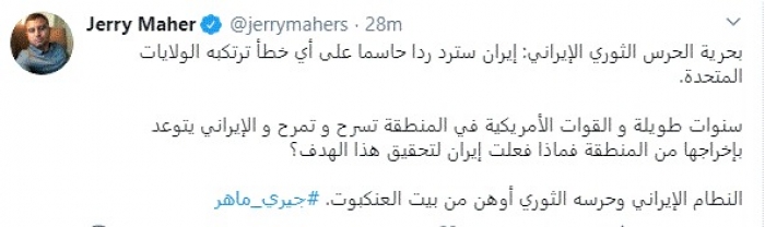 قال الكاتب الصحفي اللبناني جيري ماهر، اليوم، إن النظام الإيراني والحرس الثوري أضعف من بيت العنكبوت.