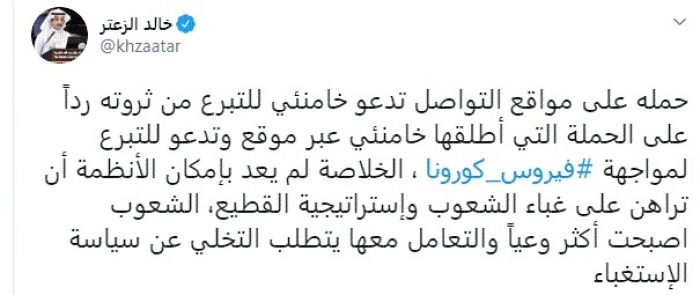 وقال في تغريدة عبر "تويتر" رصدها "المشهد العربي": "حملة على مواقع التواصل تدعو خامنئي للتبرع من ثروته رداً على الحملة التي أطلقها خامنئي عبر موقع وتدعو للتبرع لمواجهة فيروس كورونا".