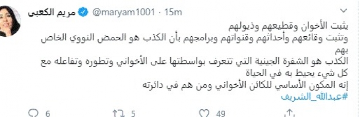 قالت الكاتبة والإعلامية الإماراتية مريم الكعبي، اليوم، إن الكذب هو نهج جماعة الإخوان الإرهابية وإعلامهم وقنواتهم وبرامجهم.