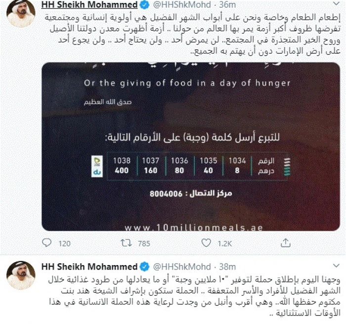 وقال في تغريدات عبر "تويتر" رصدها "المشهد العربي": "وجهنا اليوم بإطلاق حملة لتوفير١٠ ملايين وجبة أو ما يعادلها من طرود غذائية خلال الشهر الفضيل للأفراد والأسر المتعففة.. الحملة ستكون بإشراف الشيخة هند بنت مكتوم حفظها الله.. وهي أقرب وأنبل من وجدت لرعاية هذه الحملة الانسانية في هذا الأوقات الاستثنائية".