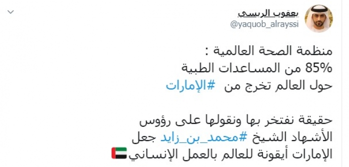 وكتب الريسي عبر تغريدة له على "تويتر" رصدها " المشهد العربي":"منظمة الصحة العالمية : 85% من المساعدات الطبية حول العالم تخرج من الإمارات".