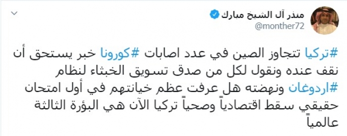 وكتب مبارك عبر تغريدة له على "تويتر" رصدها " المشهد العربي":"تركيا تتجاوز الصين في عدد إصابات كورونا".