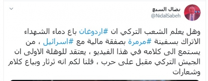 وكتب السبع عبر تغريدة له على "تويتر" رصدها " المشهد العربي":"وهل يعلم الشعب التركي أن أردوغان باع دماء الشهداء الأتراك بسفينة مرمرة بصفقة مالية مع إسرائيل".